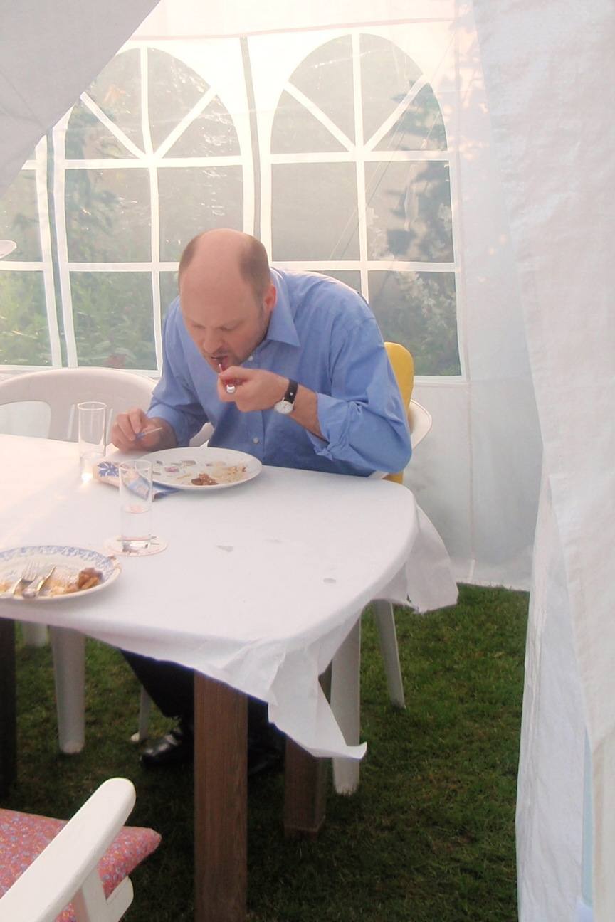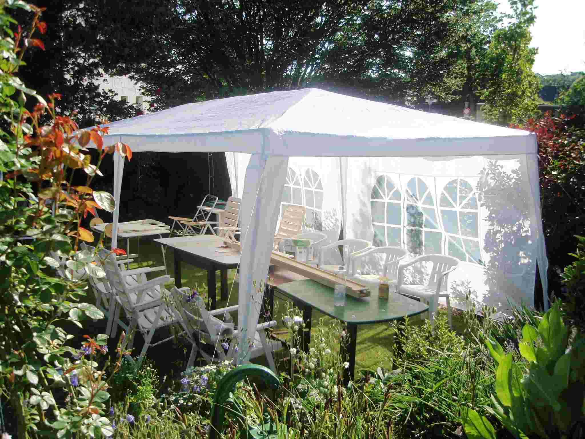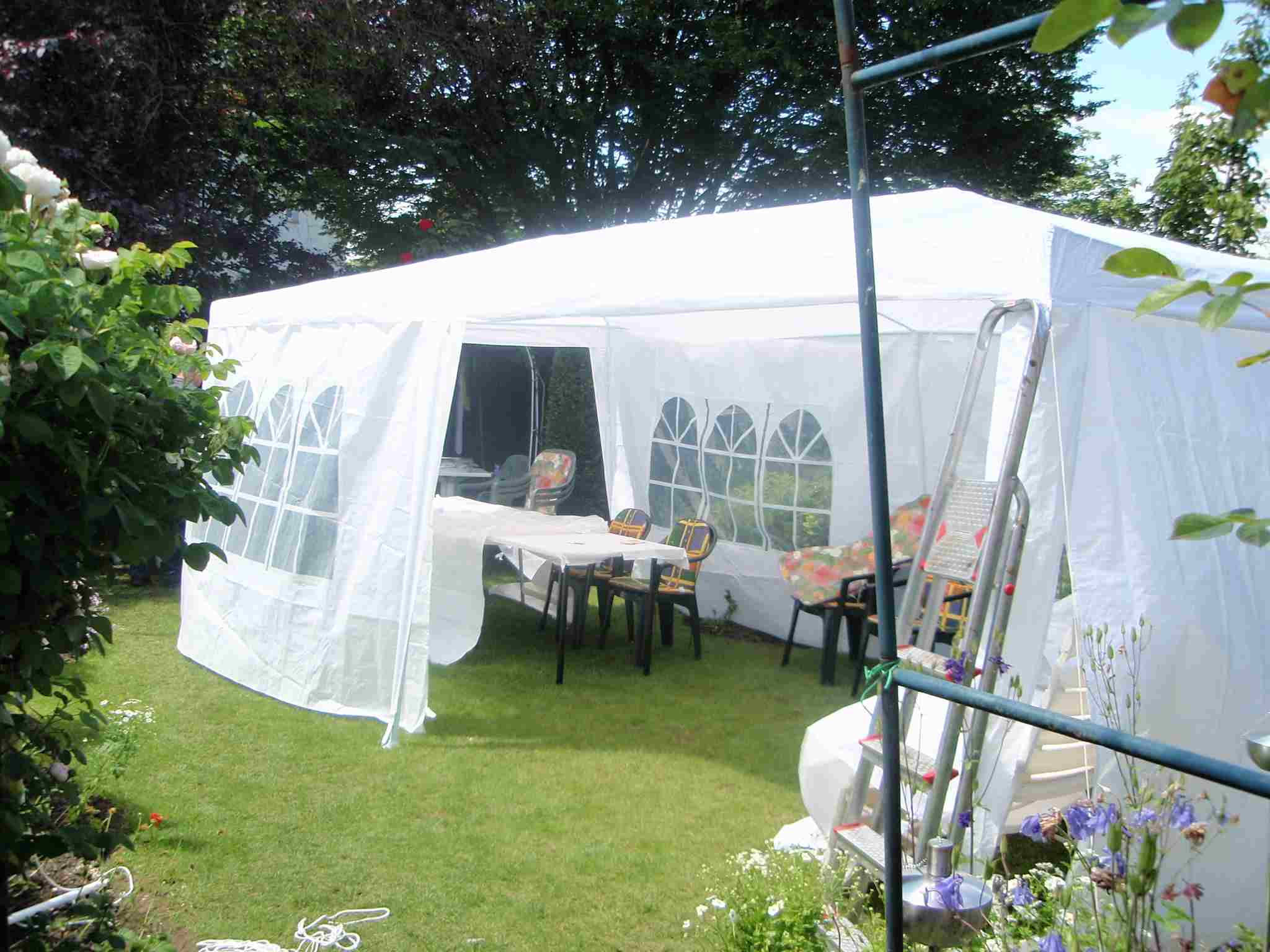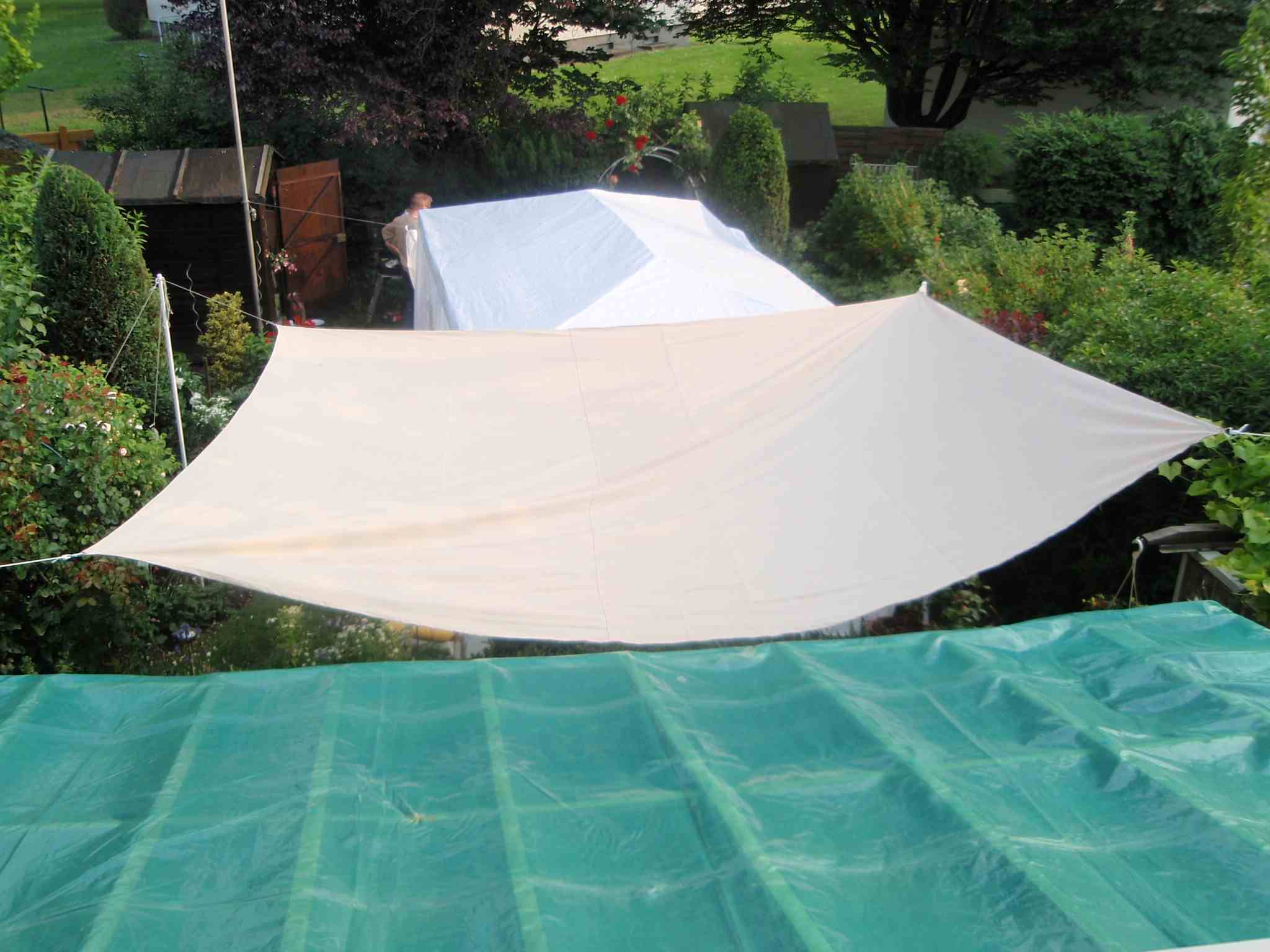 | Das Wetter sollte am Samstag teilweise bedeckt sein, aber trocken. Also bauten wir bei schönstem Sonnenschein ein Zelt als Sonnenschutz auf. |