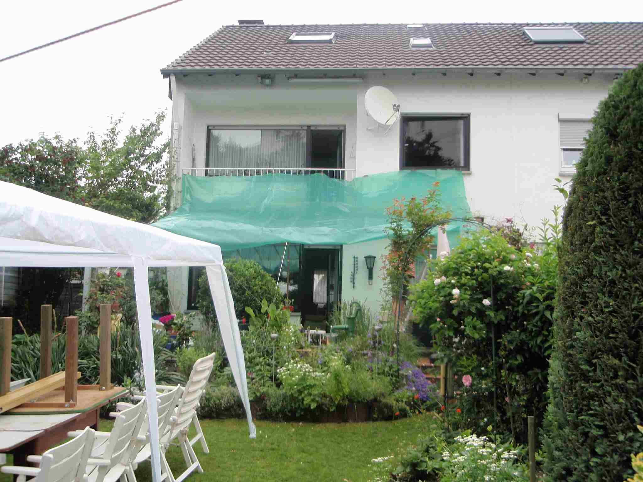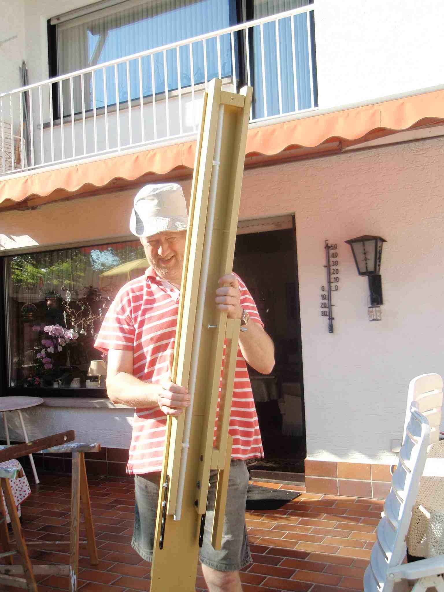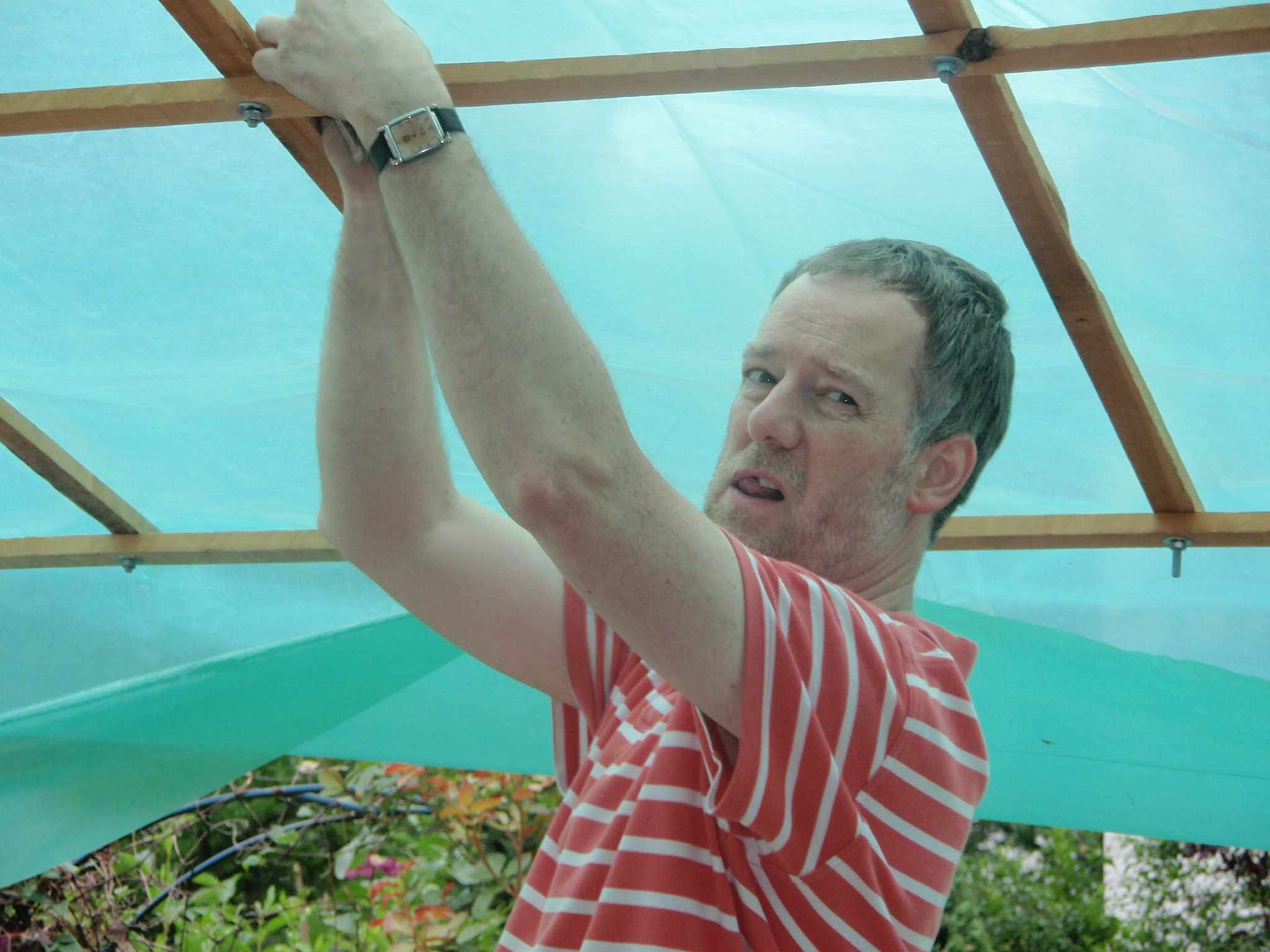 | Samstag morgen bedeckt, aber trocken, sicherheitshalber baut Thorsten auch über der Terrasse den Regenschutz auf. |