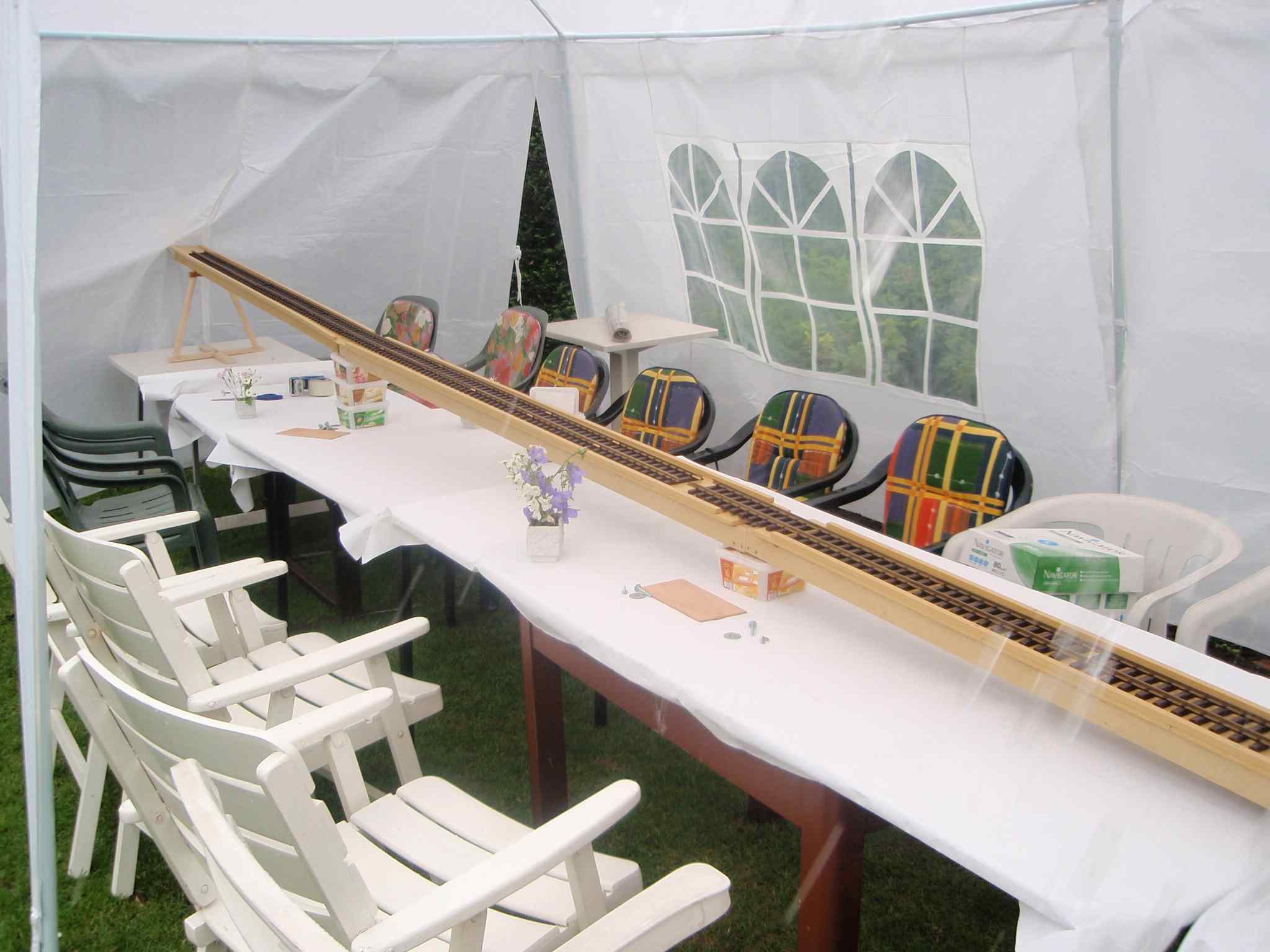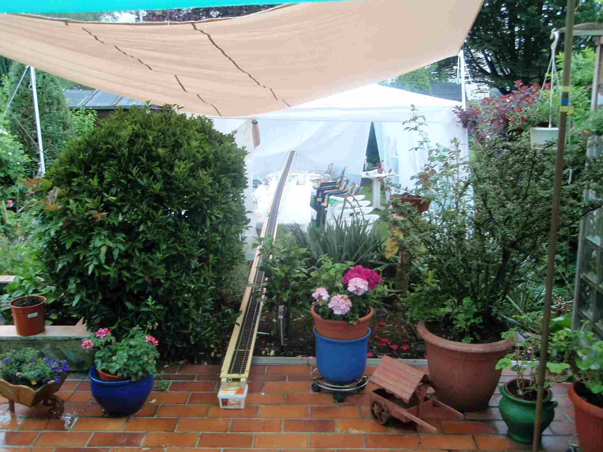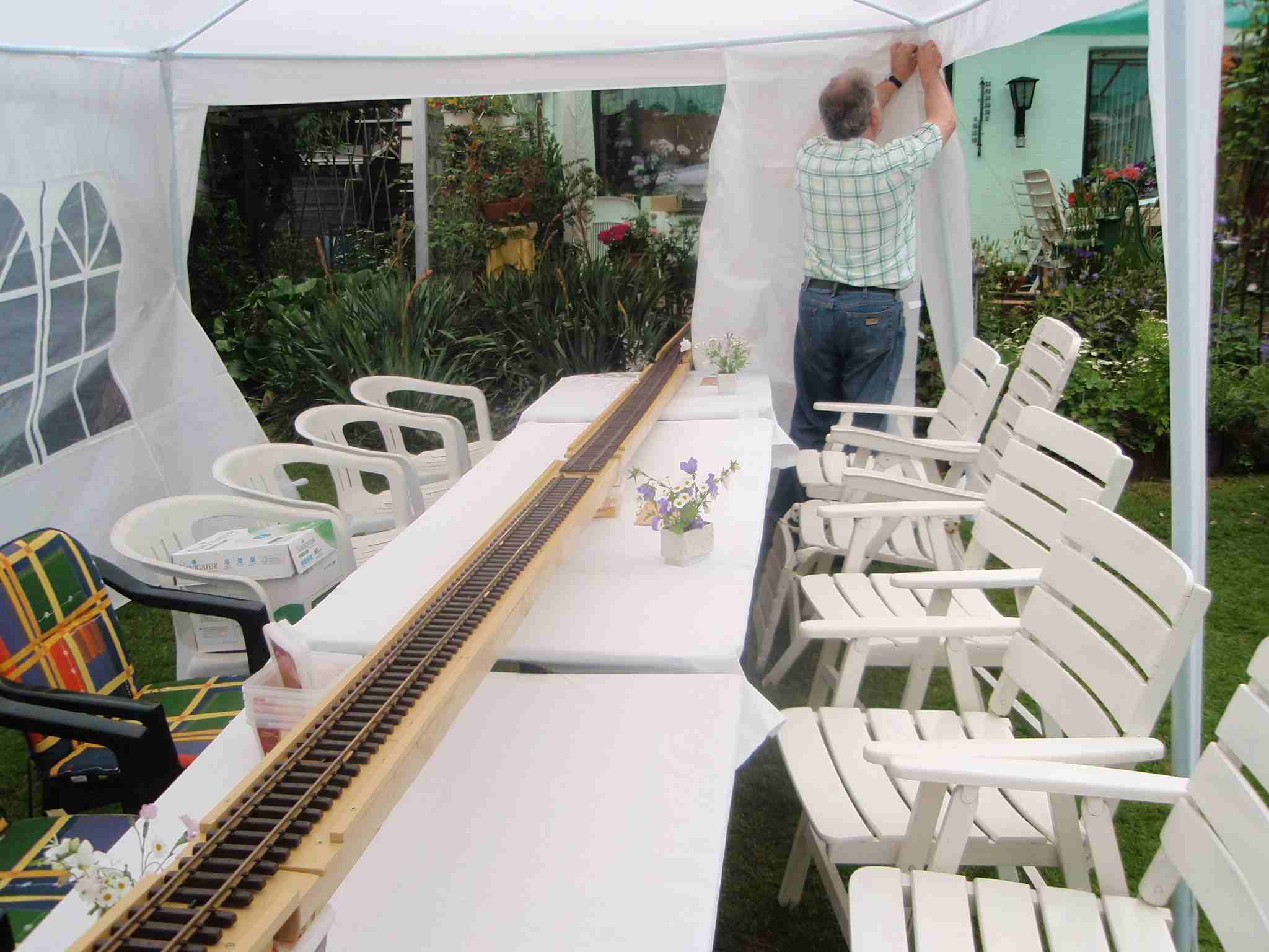 | Pünktlich um 13 Uhr beginnt der Regen, die Stühle im Zelt werden nass, die Tischenden ebenfalls und die Brücken für die Eisenbahn stehen unter Wasser. Wir müssen die Zeltwände einsetzen. Leider bedeuted dies auch, dass der Eisenbahnbetrieb eingestellt werden muss. |