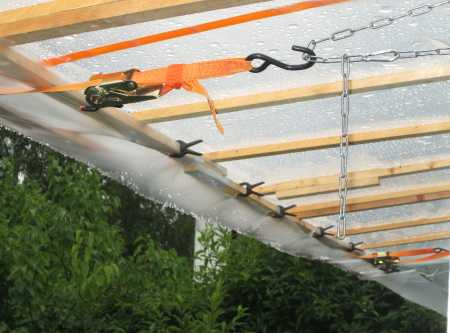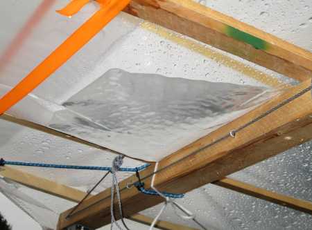 Es regnete und es bildeten sich Pfützen auf dem Dach, aber es blieb darunter trocken.