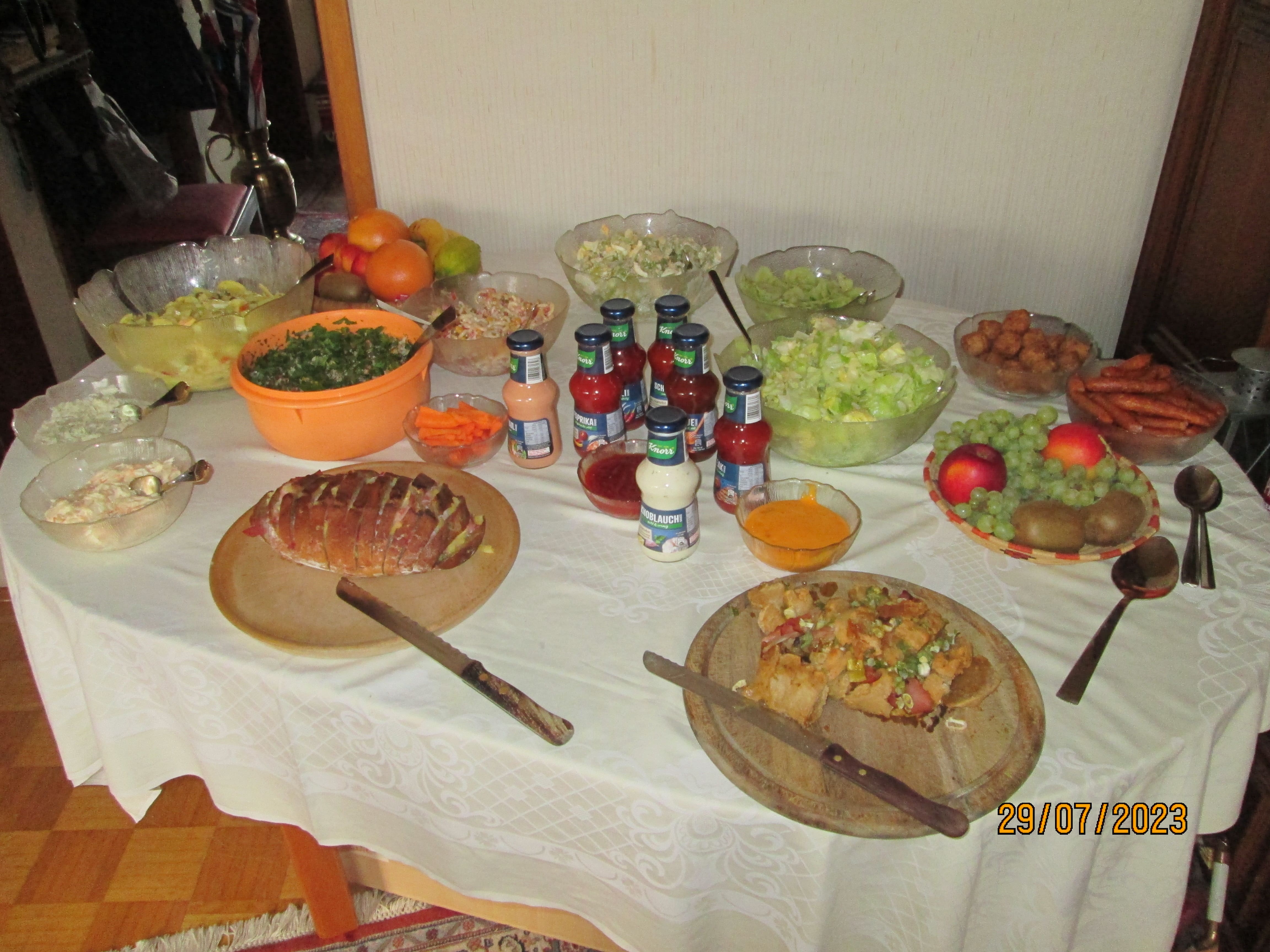Salate gab es im Wohnzimmer, auf den Pfannen bruzzelten die Steaks und Bratwürste. Das Kölsch musste auf der Terrasse geholt werden.